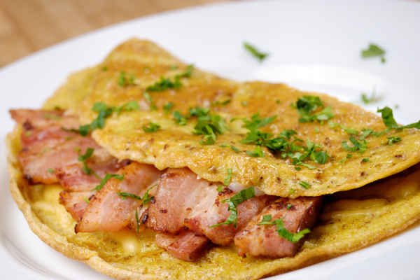 A bacon omelette is a French style omelette made of eggs and filled with bacon and tomato.