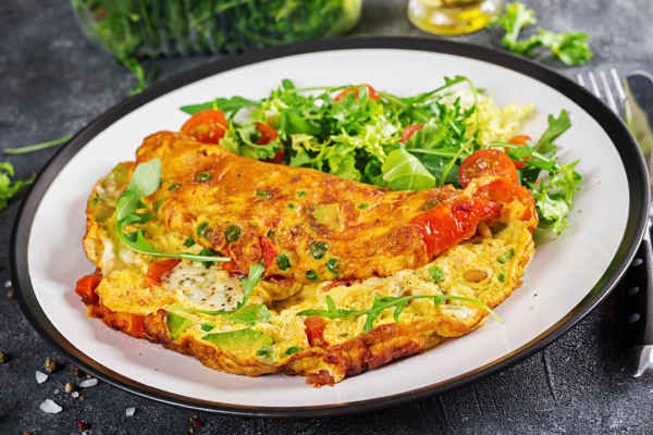 Shredded cheddar cheese, onion, chopped pepper, and avocado to the heavenly omelet.